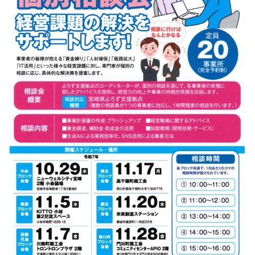 新着情報 2025.10.02NEW 中小企業・小規模事業者のための個別相談会 2025.08.18 「未来へつなぐ事業承継セミナー」 2025.07.18 「第13回みやざき地場産品商談会」の開催について 2025.07.17 「かどがわ応援振興券」について(お知らせ) 2025.07.15 「みやざきおもてなし市場2025」週末スイーツ祭り開催 新着情報一覧