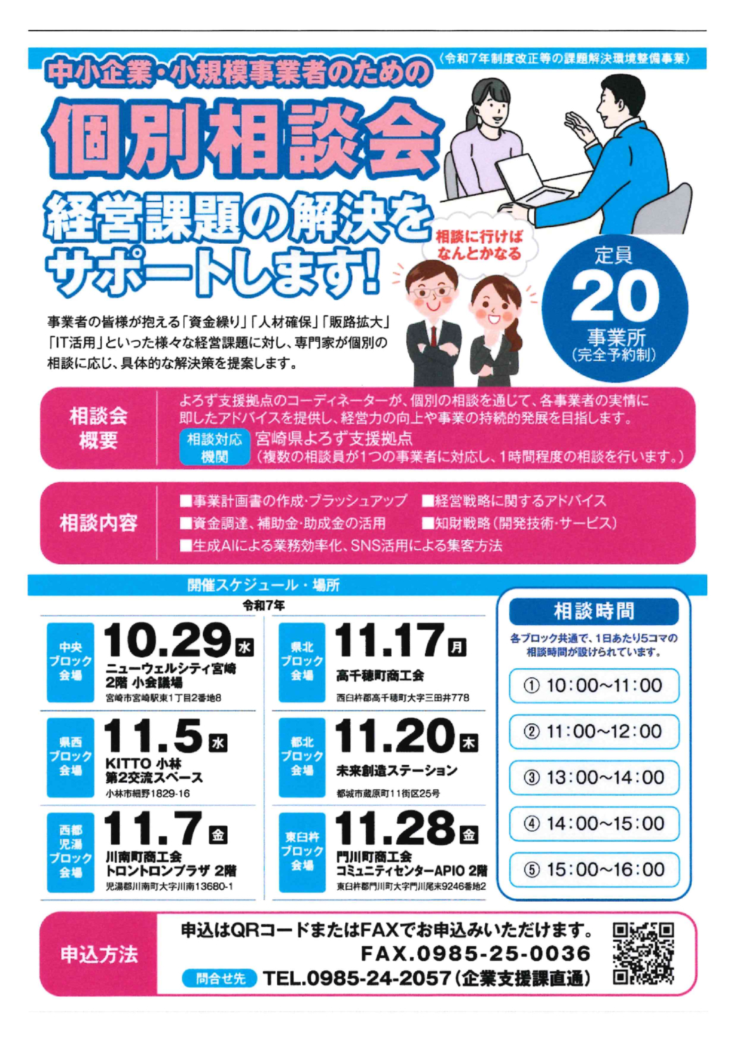 内容:事業者の方々が抱える「資金繰り」、「人材確保」、「販路拡大」、「IT活用」といった様々な