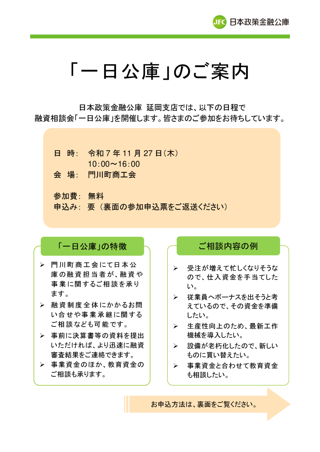 日本政策金融公庫延岡支店と連携して、融資相談会「一日公庫」を開催します。